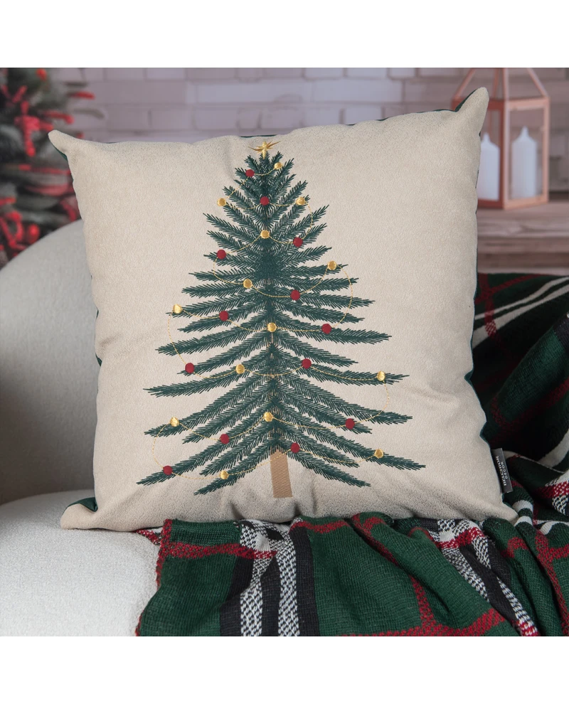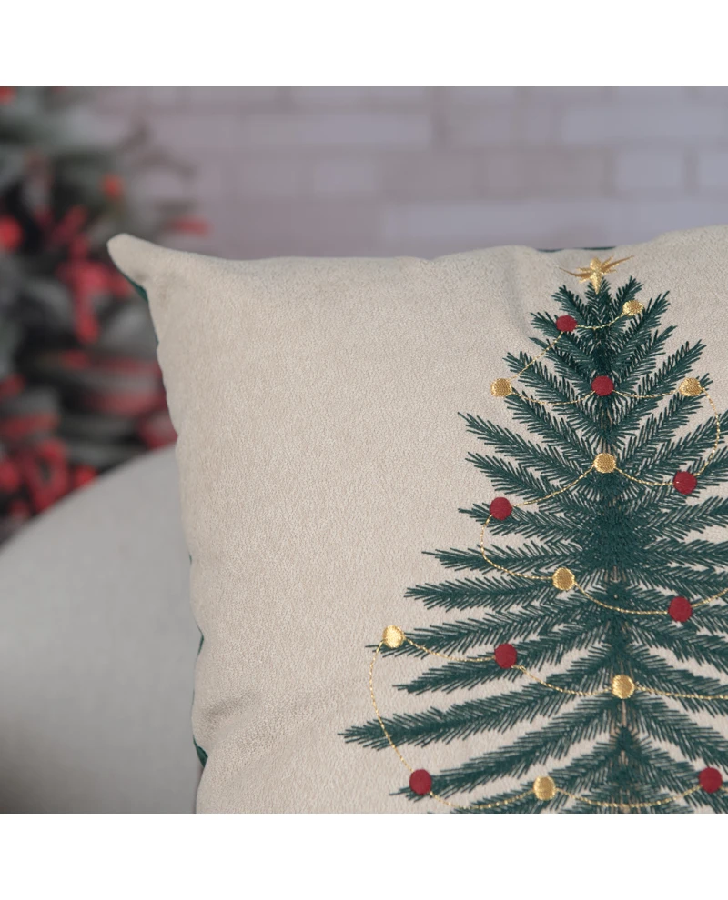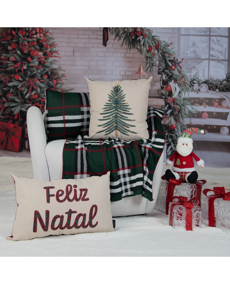 Detalhes: desenho de árvore de Natal com aplicação bordada em tons de verde, dourado e vermelho, acabamento aveludado e toque suave