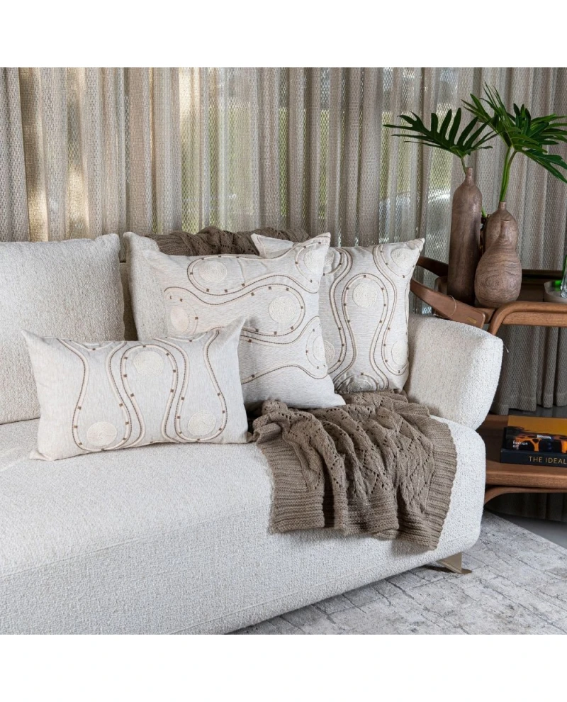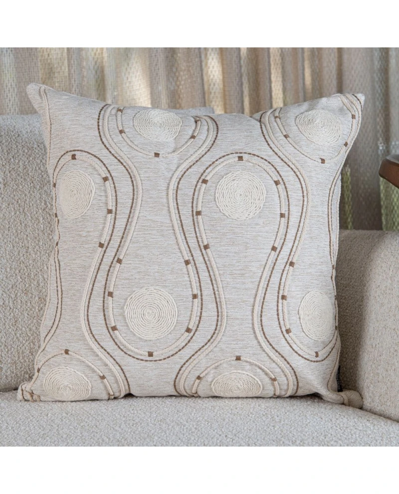 Esta capa de almofada é perfeita para quem busca unir sofisticação e aconchego em um único item. Com um trabalho artesanal delicado, ela apresenta aplicações em relevo que formam curvas elegantes e detalhes circulares, criando um visual moderno e refinado que valoriza qualquer ambiente.