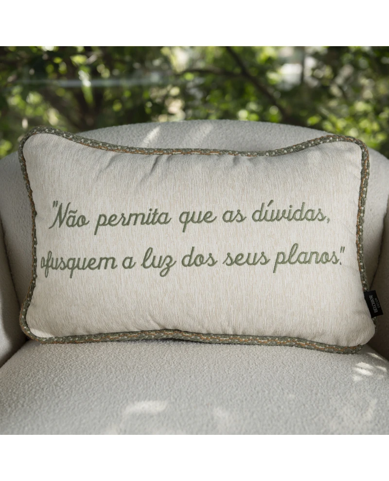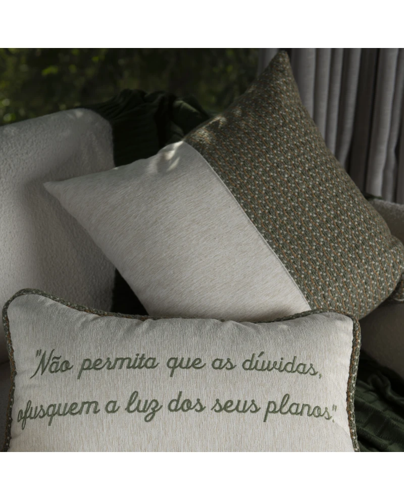 Esta capa de almofada é a escolha ideal para quem deseja acrescentar significado e beleza à decoração. Com um bordado elegante em tom verde, a peça traz a mensagem “Não permita que as dúvidas ofusquem a luz dos seus planos.”, transmitindo inspiração e serenidade para qualquer ambiente da casa.