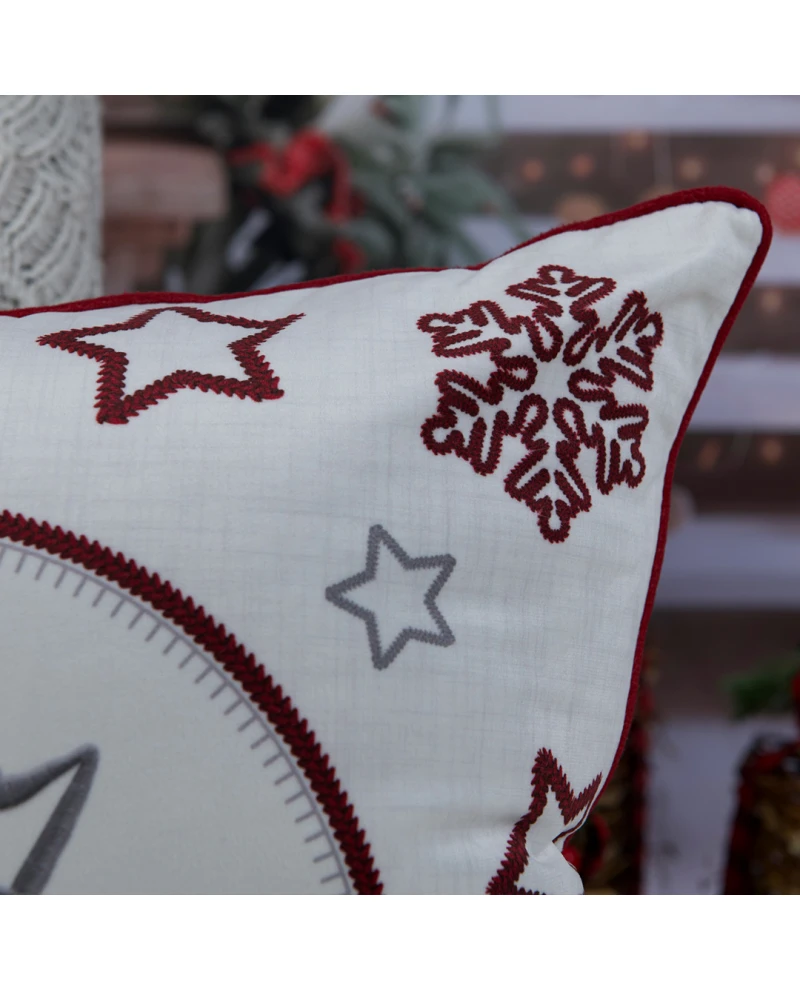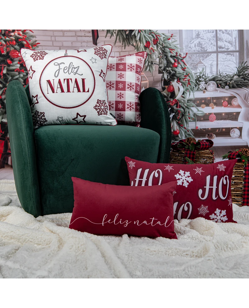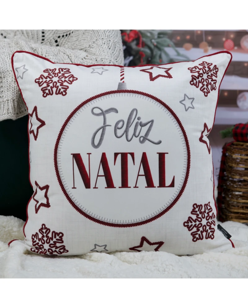 Capa de almofada com estampa temática de Natal, trazendo o clássico “Feliz Natal” no centro de uma bola decorativa, rodeada por flocos de neve e estrelas bordadas em tons de vermelho e prata. O fundo claro e o cordonê vermelho destacam o desenho, criando um visual aconchegante e festivo. Uma peça perfeita para levar o espírito natalino à sua casa, seja no sofá, na poltrona ou sobre a cama.
