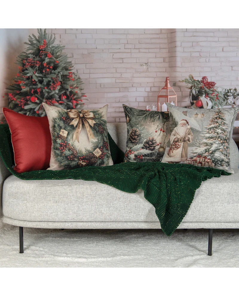 Capa de almofada com estampa de guirlanda natalina composta por galhos de pinheiro, pinhas, frutinhos vermelhos e laço dourado central. Uma peça elegante e atemporal, perfeita para quem deseja uma decoração de Natal clássica e sofisticada.