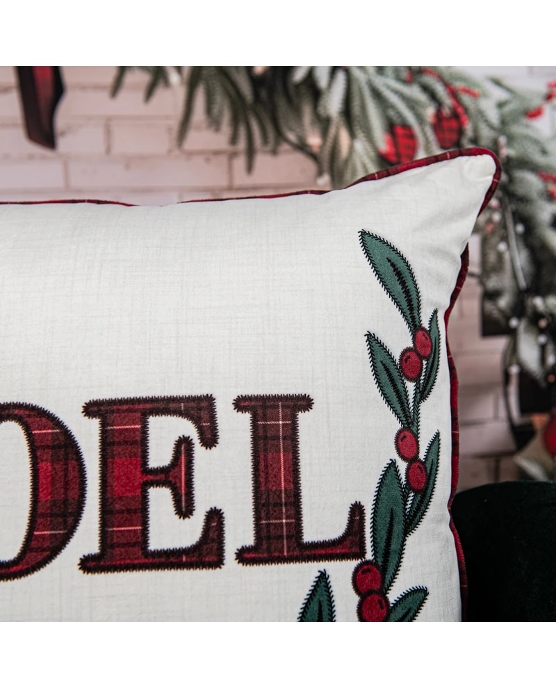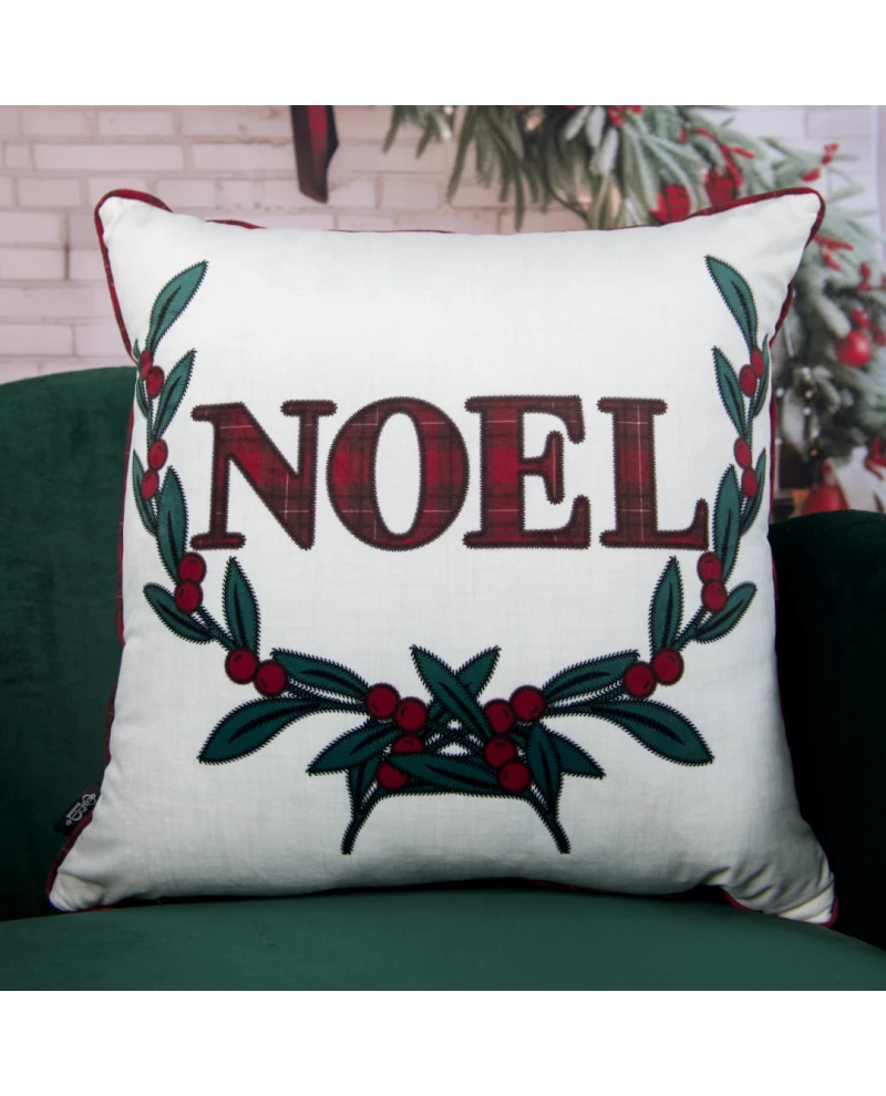 Capa de almofada com estampa natalina que traz a palavra “NOEL” em destaque, com acabamento em xadrez vermelho e uma guirlanda verde com frutos vermelhos ao redor. Um design que transmite todo o encanto e a tradição do Natal. O fundo claro realça os detalhes da estampa, enquanto o cordonê xadrez nas bordas complementa a peça com um toque sofisticado e acolhedor. Ideal para compor sofás, poltronas e camas, criando uma decoração festiva e elegante.