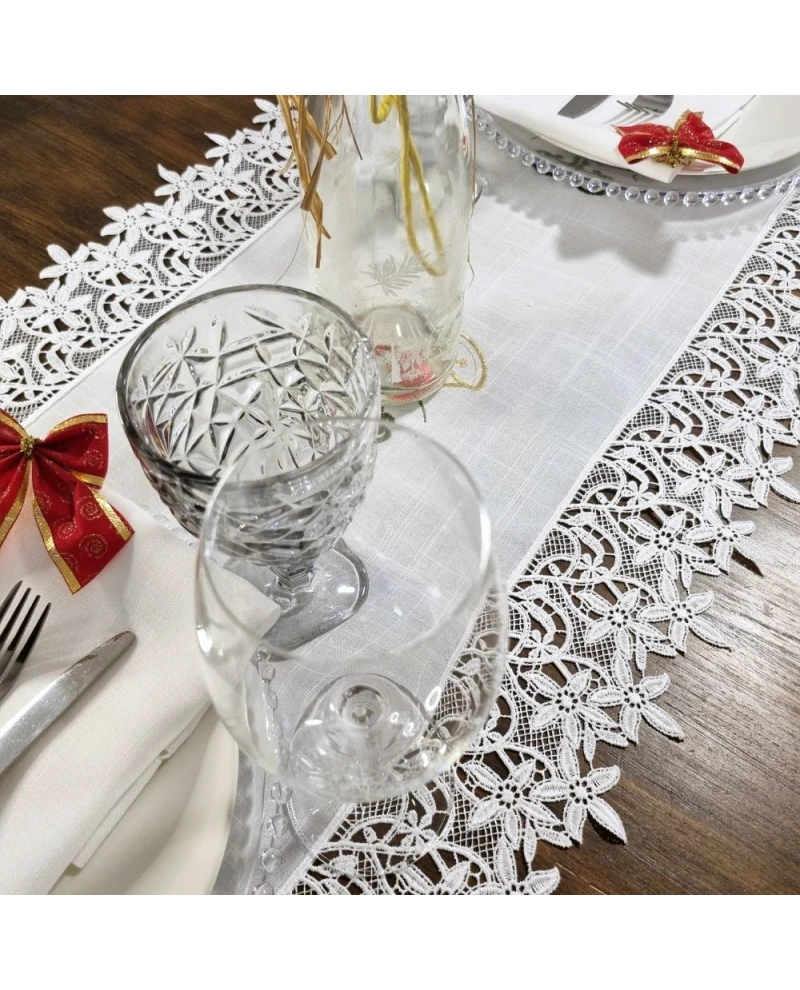Este Caminho de Mesa Natalino foi desenvolvido para quem deseja uma decoração refinada e encantadora para as festas. O linho branco traz leveza, elegância e caimento impecável, enquanto o barrado de renda trabalhada adiciona um toque sofisticado e delicado que valoriza toda a peça. O bordado em alta definição, com velas, sinos, flores e detalhes dourados, cria um visual marcante e festivo, muito mais elaborado do que os caminhos tradicionais.