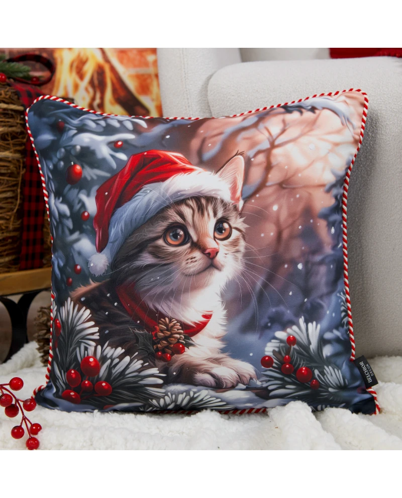 Capa de almofada natalina com estampa de gatinho usando gorro de Papai Noel, rodeado por galhos com neve e frutinhas vermelhas. Um modelo cheio de encanto e delicadeza, que traz o espírito do Natal com um toque fofo e aconchegante para sua decoração.