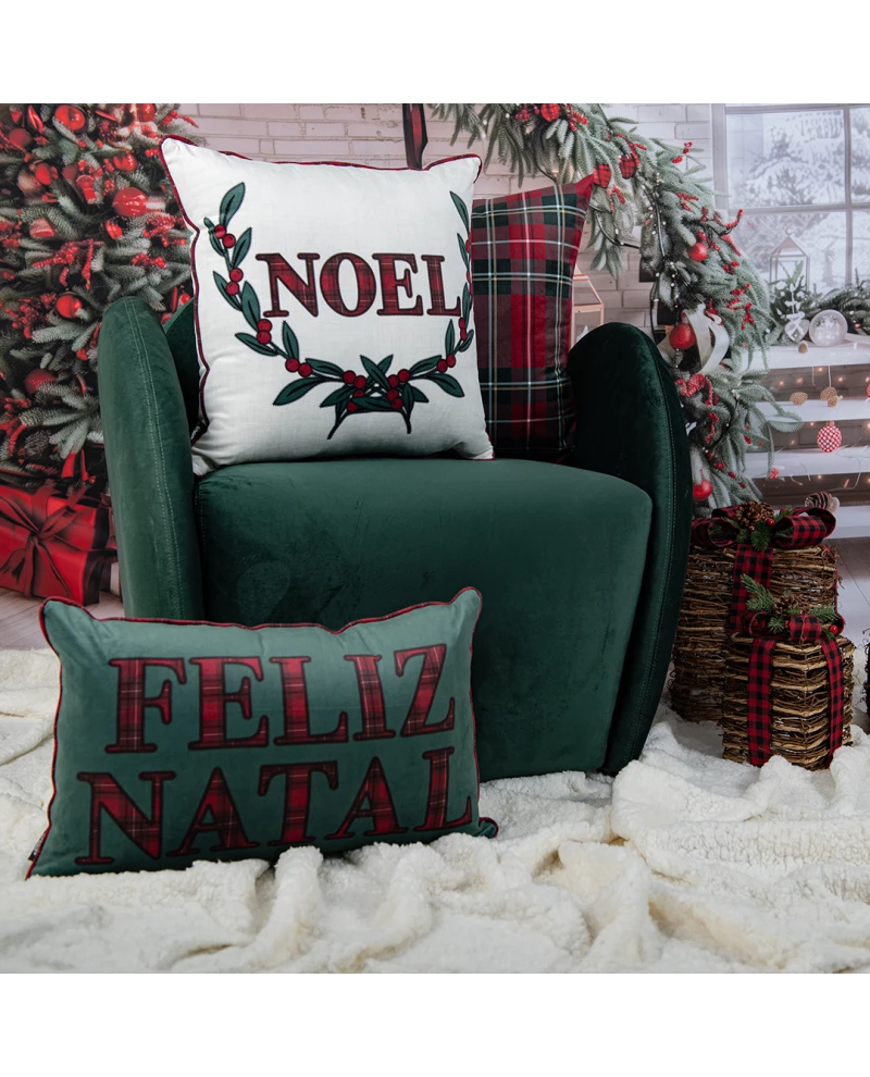 Essa capa de almofada retangular traz o charme clássico das festas com a frase Feliz Natal estampada em um lindo padrão xadrez vermelho e verde. O fundo verde profundo valoriza o desenho e cria um visual natalino elegante, ideal para deixar sofás, poltronas ou camas com um toque festivo e sofisticado.