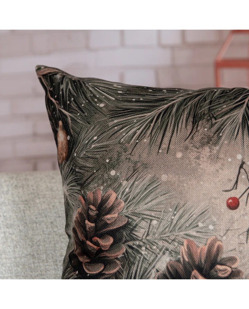 Capa de almofada com estampa de pinhas, galhos e frutinhos vermelhos sob um fundo neutro com efeito de neve. Um modelo elegante e natural, ideal para compor uma decoração natalina mais sofisticada e acolhedora, trazendo o charme do inverno para o ambiente.
