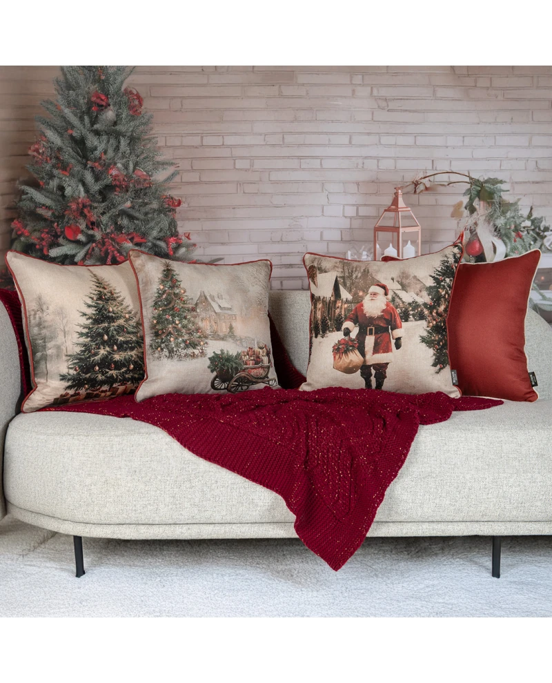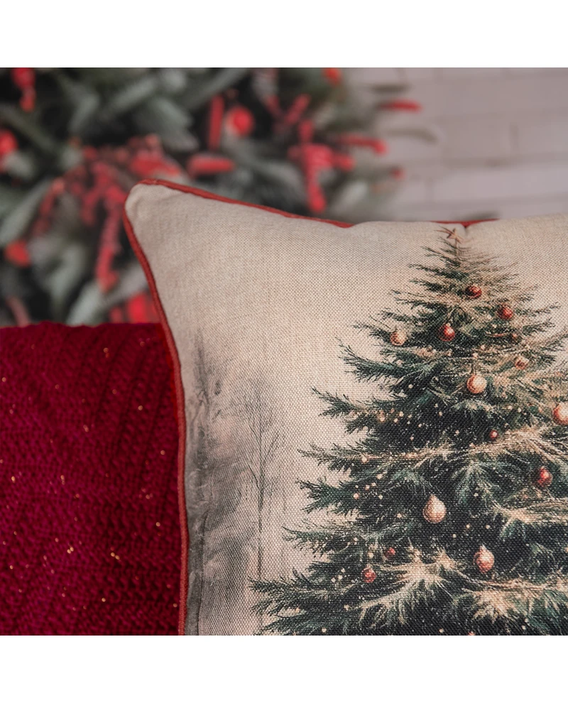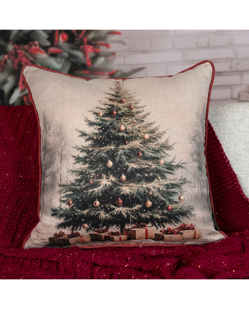 Capa de almofada com estampa de árvore de Natal tradicional, decorada com bolas douradas e vermelhas e cercada de presentes. Um design elegante e acolhedor que traz o verdadeiro clima natalino para sua casa. Com acabamento em cordonê vermelho e tecido encorpado, essa peça é ideal para compor sofás, poltronas e cantinhos temáticos, harmonizando perfeitamente com outras estampas natalinas.