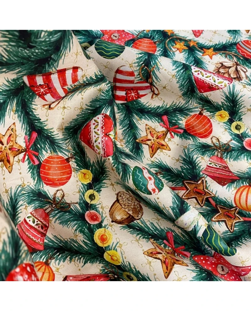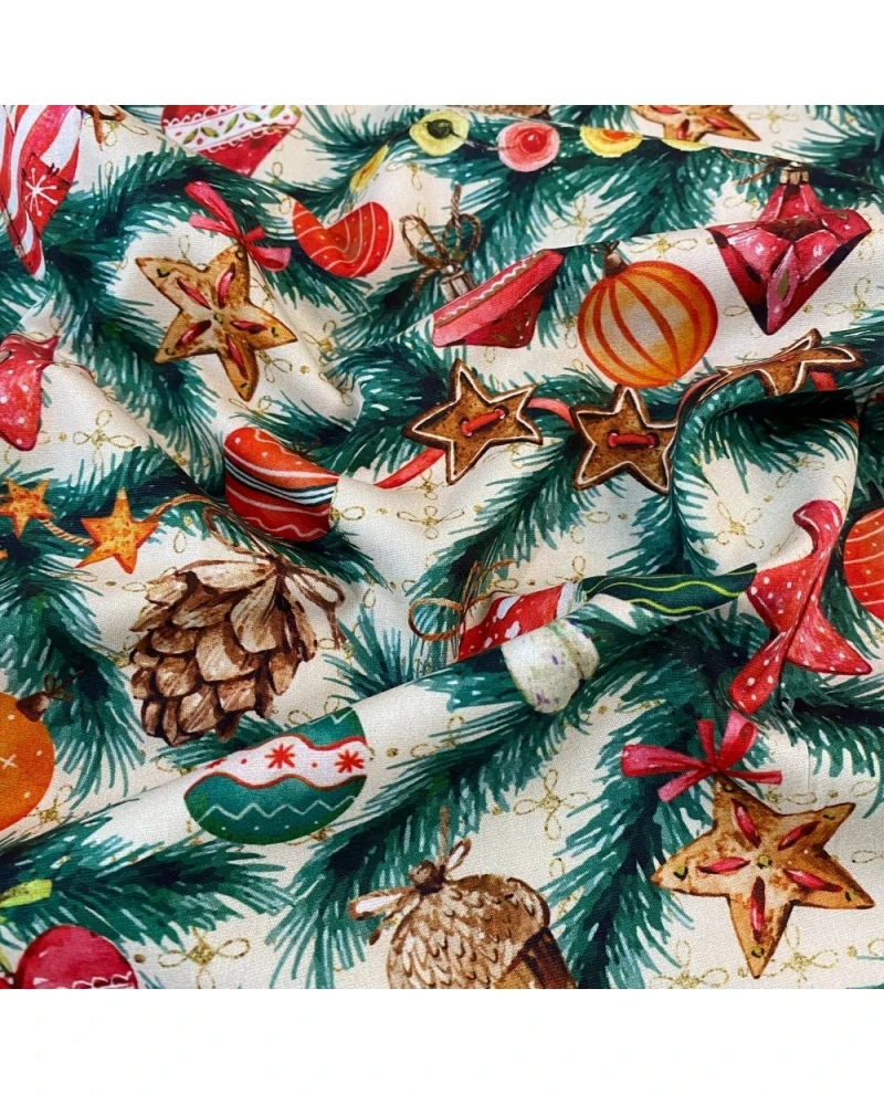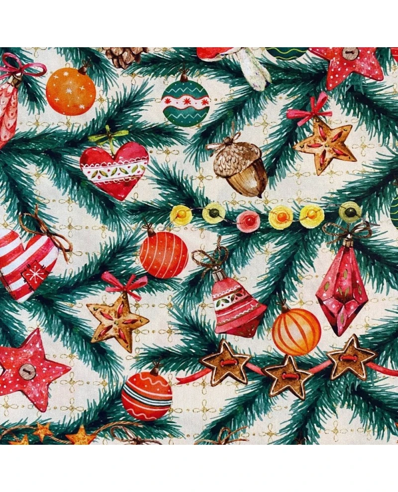 O Tricoline Digital Ramos Natalinos com Enfeites é ideal para quem busca um tecido temático vibrante, cheio de detalhes e com visual artesanal. A estampa traz ramos verdes de pinheiro decorados com estrelas, bolas coloridas, cogumelos, pinhas e pequenos ornamentos natalinos que criam uma composição encantadora e muito rica visualmente.