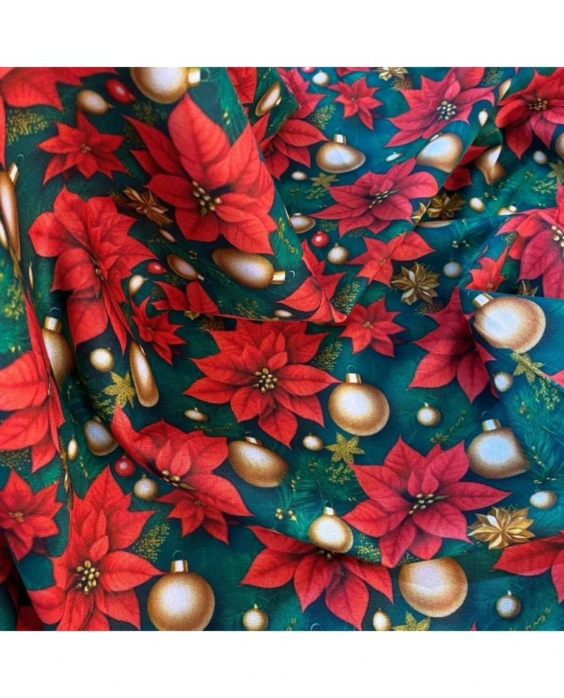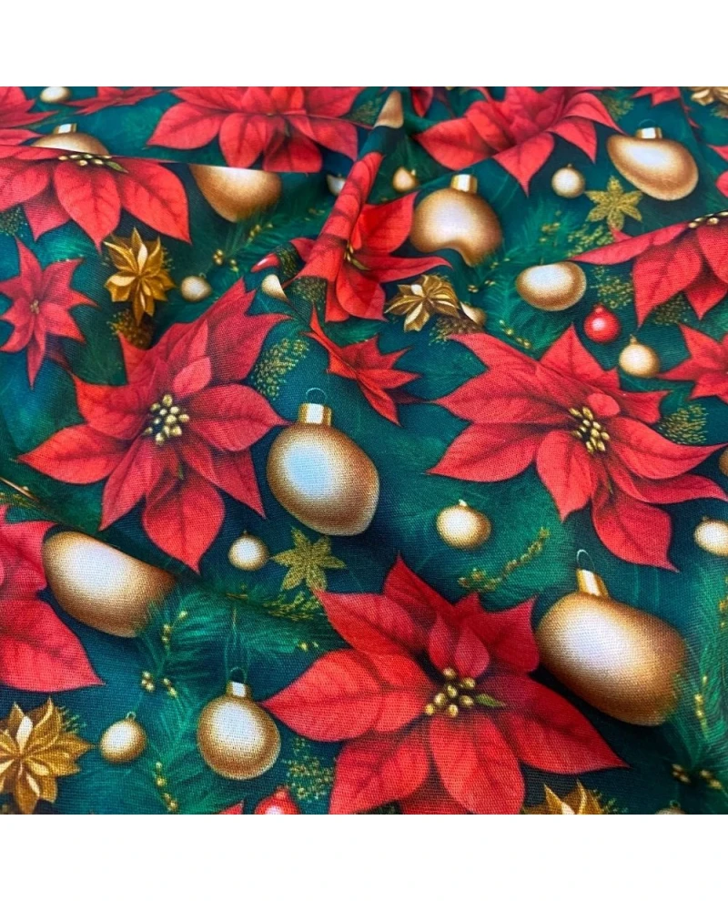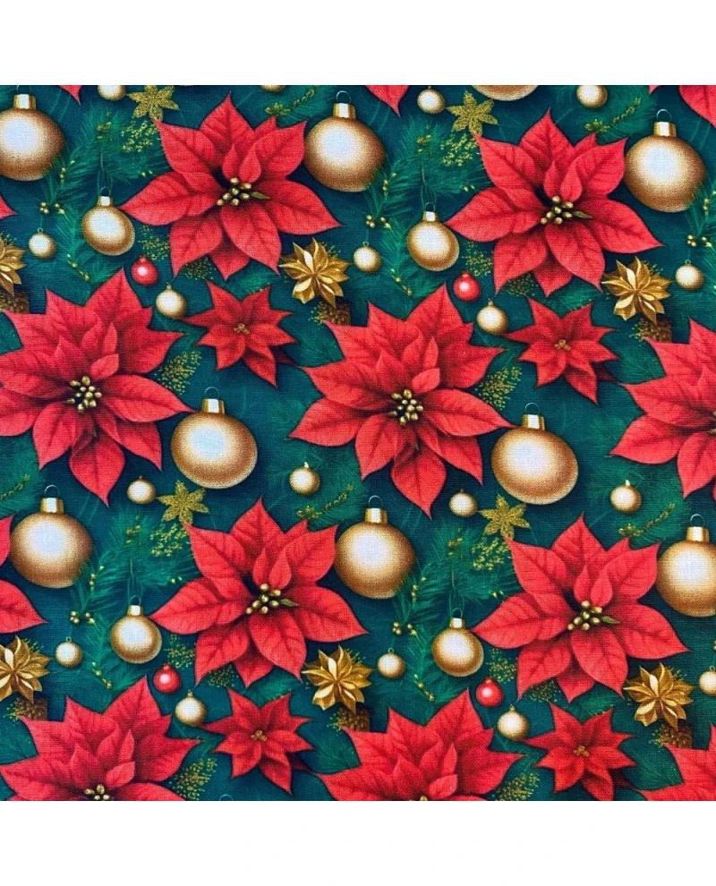 Sua estampa traz flores vermelhas (bico-de-papagaio), bolas douradas e folhagens verdes em uma composição elegante e festiva. As cores vivas e o brilho sutil criam um visual sofisticado, ideal para toalhas de mesa, jogos americanos, aventais, almofadas, guirlandas, enfeites e lembranças natalinas, proporcionando charme e requinte à decoração.