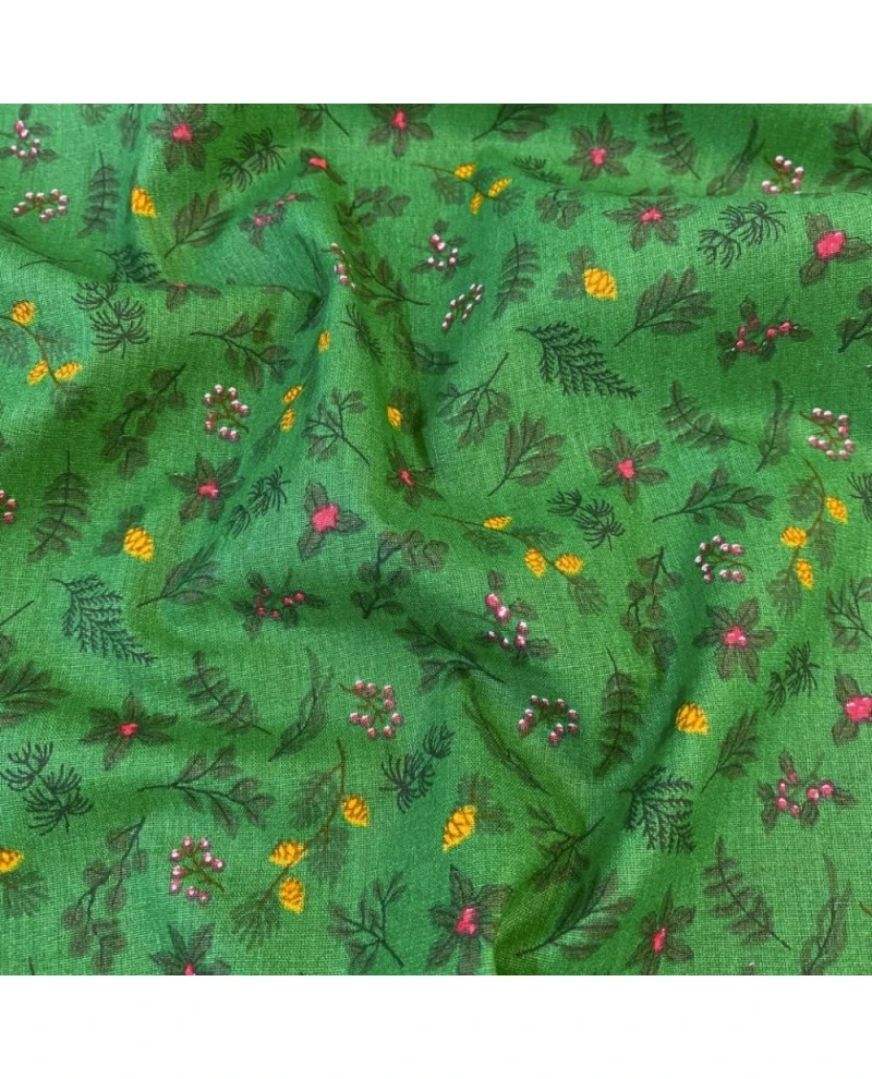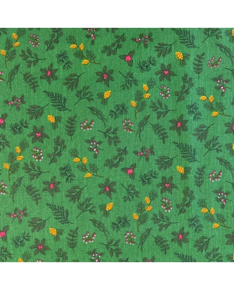Com fundo verde intenso e estampa delicada de folhagens, flores e pinhas em tons de vermelho e amarelo, o tecido transmite o clima acolhedor e festivo do Natal. É ideal para a confecção de toalhas de mesa, jogos americanos, guardanapos, enfeites, patchwork, bonecos e lembranças natalinas, trazendo charme e elegância artesanal a cada criação.