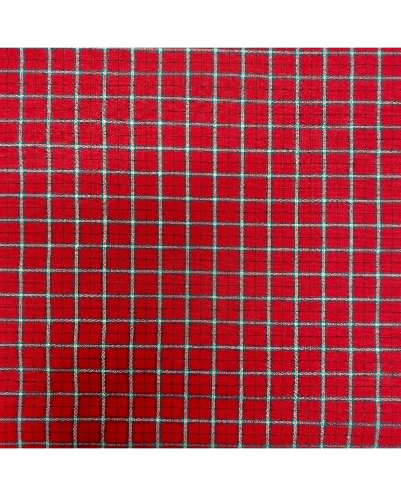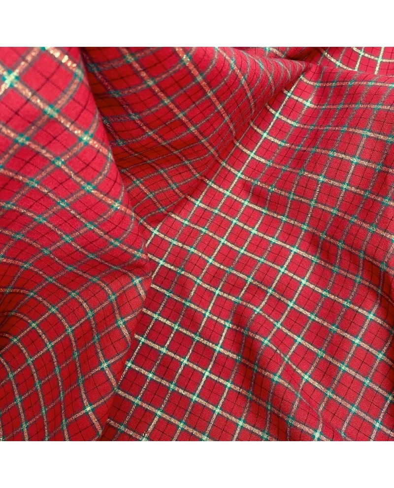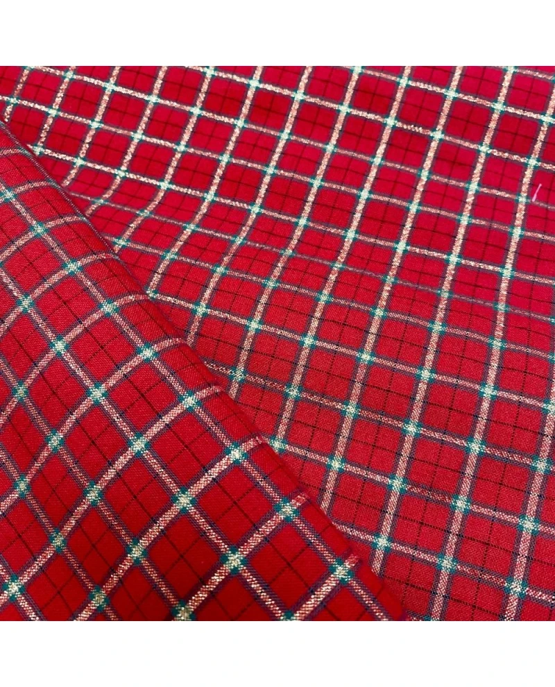 Seu padrão xadrez vermelho com fios dourados e detalhes em verde traz um visual sofisticado e festivo, perfeito para camisas, aventais, almofadas, toalhas de mesa, jogos americanos e enfeites natalinos. O brilho sutil dos fios metálicos valoriza as composições e adiciona elegância à decoração.